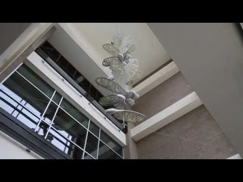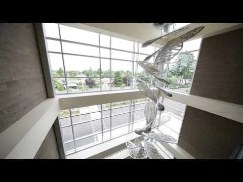 “Samara”is a kinetic sculpture installed at the Henrietta Lacks Bioscience High School in Vancouver Wa. It represents the winged maple seed, known as a Samara, taking its spiraling journey through the air. Bigleaf Maple is second to Red Alder among native hardwood species in abundance and in commercial importance in the Pacific Northwest. The sculptural composition consists of 16 maple seeds in a spiral formation, each approximately 6’ in length. Each individual wing shape was cut out of sheet aluminum, and all the drops were melted down and cast to create the seed pods. These components were welded together with a brass mesh integrated between the two layers. A motor mounted above keeps the entire composition continually moving. The maple seed represents the start of a new life. Each of these little flying whirligigs has the potential to grow into a giant tree. Similar to those in high school who are just beginning their life’s journey. The sculpture sparks the imagination- its motion, the journey it takes, twirling towards soil- is captivating. Where will it land?